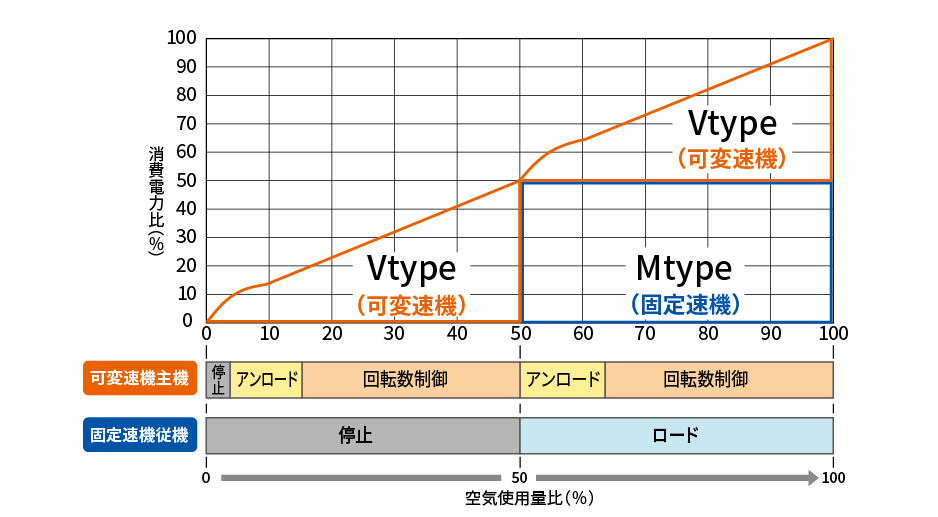 可変速制御機1台・固定速制御機1台(または固定速制御機2台)を内蔵し、不可変動を吸収しながら最適な省エネ運転を行います。